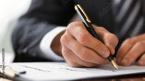 Business professional signing a document with a pen, emphasizing agreement, contract, or partnership in a formal setting.