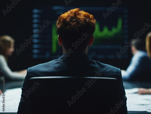 Business professionals analyzing data trends in a dark conference room with graphs on a screen, focusing on strategy and decision-making.