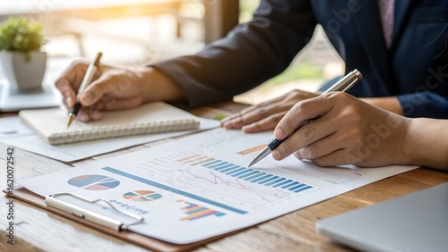 business, finance, analysis, financial, report, datum, chart, graph, planning, strategy, teamwork, collaboration, meeting, office, work, document, professional, corporate, people, hand, pen, writing, desk, wooden, table, indoor, diagram, businessperson, investment, economy, market, growth, performance, presentation, discussion, paperwork, checking, examining, closeup, view, modern