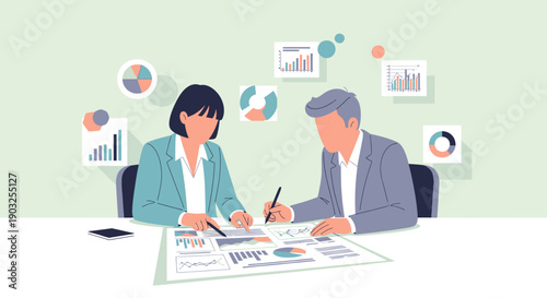 Business professionals collaborating on data analysis at a meeting table with various charts and graphs surrounding them