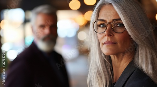 portrait, woman, man, goggles, background, blurred, city, street, bokeh, urban, sharpened, fashion, stylish, mature, confidence, expression, serious, adult, couple, candid, elegance, light, depth, professional, human relationships, evening, atmosphere, modern, sophisticated, characteristic, facial features, coiffure, thoughtful, gaze, intimate, connected, dynamic, character, mood, narrative