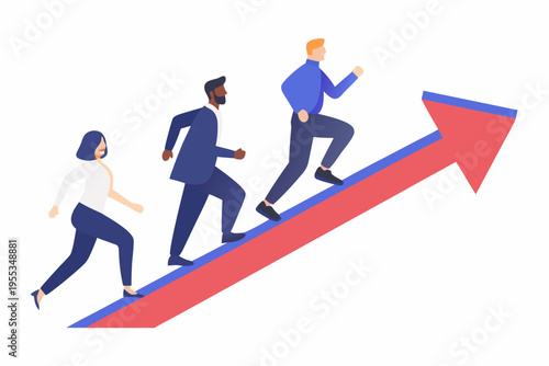 Business professionals running upwards on a red arrow illustrating growth