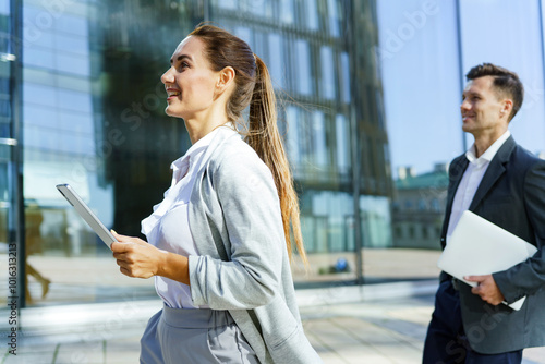 business, professional, office, woman, walking, collaboration, productivity, modern, architecture, glass building, smiling, confidence, daytime, discussion, teamwork, corporate, career, attire, casual attire, technology, tablet, laptop, city, urban, communication, networking, meeting, leadership, engagement, strategy, outdoors, success, goal, achievement, lifestyle, cheerful, planning, colleague, friendly, environment, consultancy