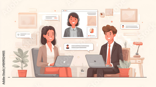 Business professionals working on laptops in a modern office while having a video conference call with a remote colleague, flat vector illustration of hybrid work and team collaboration.