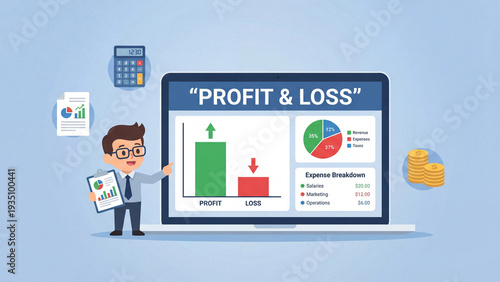 profit, loss, financial, report, accounting, revenue, expense, business, performance, analysis, corporate, presentation, breakdown, taxation, salary, marketing, operation, evaluation, budget, datum, visualisation, income, statement, calculating machine, management, economy, earning, expenditure, balance, financial, quarter, annual, calculation, cost, return, investment, growth, decayed, indicator, metric, dashboard, chart, percentage, comparison, figure, trend, money, assessment, planning