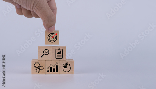 business strategy, Action plan, Goal and target, hand stack woods block step on table with icon about business strategy and Action plan. business development concept. copy space.