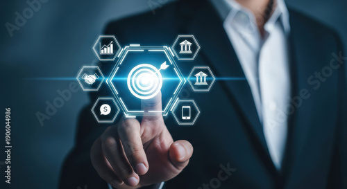Business Target Achievement Goal Focusing on Success Business Man Touching Virtual Graphic Screen Pointing Strategy Finance Banking Technology Solution