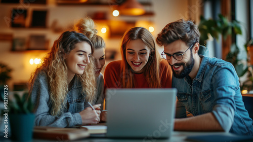 Business team brainstorming around a laptop in a cozy, modern office setting, teamwork, casual attire, creative atmosphere, copy space
