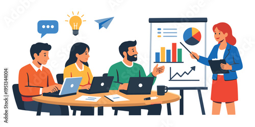 Business team collaborating, analyzing data and discussing strategy. Woman presenting charts and graphs to colleagues using laptops