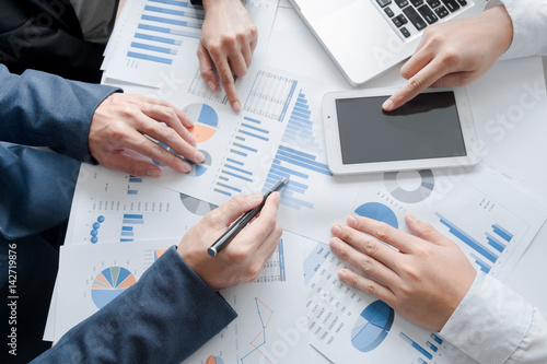 Business team hands at working with business plan and a tablet on office desk, Top view shot.