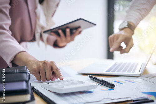 Business team meeting present. secretary presentation new idea and making report to professional investor with new finance project plan during discussion at meeting