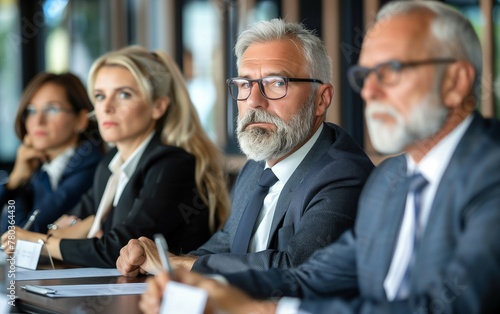 business, team, senior, man, woman, to sit, table, during, meeting, office, diverse, diversity, equity, researching, highlight, cultural, oneness, culture, people, grey, hair, suit, goggles, look, serious, listen, boss, speech, natural, lighting, studio, portrait, photo, older, conference, room, beard, work, together, success, company