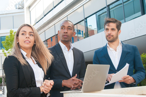 Business team with laptop watching exciting scene outdoors. Two men and woman in office suits standing outside and looking into distance. Vision concept