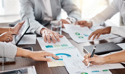 Business teamwork hands, paperwork and planning annual report data, research and budget in office. Company discussion with documents in strategy meeting, graphs analytics and financial stats progress