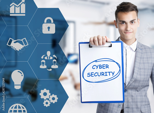 Business, technology, internet and network concept. Young businessman shows a keyword: Cyber security
