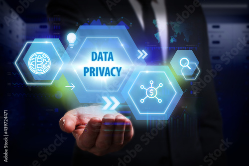 Business, Technology, Internet and network concept. Young businessman working on a virtual screen of the future and sees the inscription: Data privacy