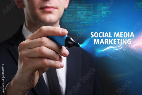Business, Technology, Internet and network concept. Young businessman working on a virtual screen of the future and sees the inscription: Social media marketing