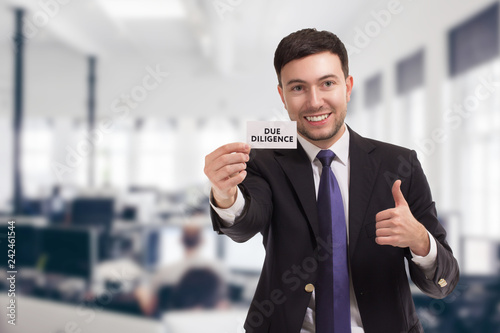 Business, technology, internet and networking concept. Young entrepreneur showing keyword: Due diligence