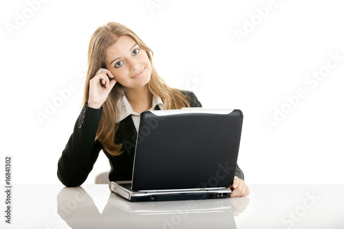 business, woman, beautiful, businesswoman, office, workplace, laptop, work, working, modern, cheerful, communication, corporate, desk, executive, female, adorable, adult, confident, attractive, blond, businessperson, computer, friendly, indoor, cyberspace, job, notebook, people, person, pretty, professional, secretary, success, successful, suit, support, technology, young, happy, smile, portrait, sitting, isolated, white, background, studio, girl, men at work
