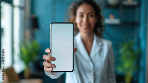 Business woman holds smartphone with white screen mockup in office