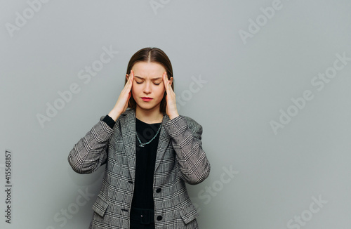 Business woman in a jacket stands on a gray background and suffers with a headache, closes her eyes and touches her fingers to the temples.