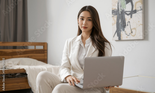 business, woman, laptop, office, modern, professional, suit, working, minimalistic, stylish, room, technology, female, casual attire, indoor, furniture, bed, computer, businesswoman, lifestyle, portrait, elegant, workspace, communication, remote, sitting, focused, young, adult, career, success, productivity, home, design, contemporary, light, bright, attractive, confident, smart, digital, online, task, work, home office, creative
