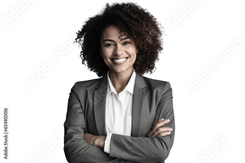 Business woman portrait isolated on white transparent background, Afro businesswoman in suit, crossed arms, PNG
