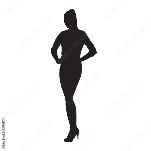 Business woman standing with hands on hips, isolated vector silhouette, front view