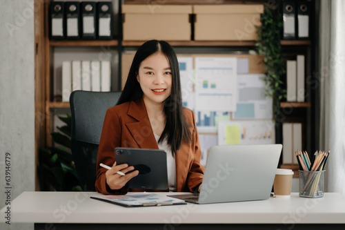 Business woman using tablet and laptop for doing math finance on an office desk, tax, report, accounting, statistics, and analytical research concept
