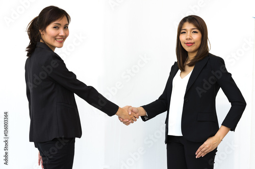 Business women smiling and shaking hands after achieving a trade agreement