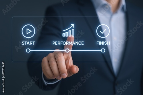 performance, management, system, digital, interface, finish, business, man, suit, display, start, technology, touch, screen, point, activate, progress, chart, graph, icon, growth, improvement, success, target, goal, strategy, plan, solution, innovation, leadership, career, development, corporate, futuristic, ai, automation, efficiency, optimization, transformation, virtual