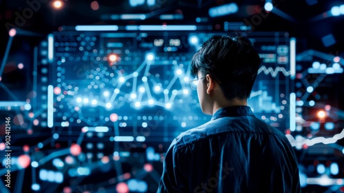 Businessman analyzing a digital stock market chart, blue and black background, investment concept.