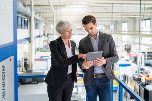 businessman, senior, businesswoman, tablet, talking, factory, digitization, copy space, technology, 2, people, industry, computer, communication, adult, online, business, woman, man, sport, jacket, competence, discussing, successor, expertise, wireless, suit, caucasian, pair, young, using, digital, succession, upper, floor, manager, work, meeting, enterprise, plant, workshop, industrial, hall, management, cyberspace, company, life events, standing
