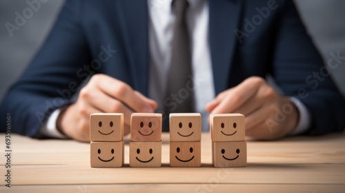 Businessman and wooden blocks with happy face, business concept. Generative AI