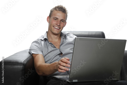 man, computer, movable, young, student, businessman, business, personal computer, smiling, happy, success, modern, generation, beauty, smile, technology, work, search, contractor, caucasian, couch, seated, black, shirt, blond, background