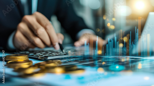 businessman, calculating, financial, report, growth, chart, analysing, datum, investment, finance, business, strategy, corporate, banking, accounting, concept, investment, budget, planning, market, statistic, economy, coin, calculating machine, profitability, analysis, revenue, expenditure, projection, office, success, economic, savings, money, digital, wealth, business report