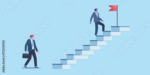 business, career, success, goal, achievement, ambition, progress, growth, step, stair, climbing, upward, direction, flag, target, destination, opportunity, challenge, motivation, inspiration, strategy, planning, leadership, entrepreneur, corporate, office, suit, attaching, briefcase, man, person, figure, illustration, vector, minimalist, simple, clean, background, blue, red, symbolic, journey, reaching, overcoming