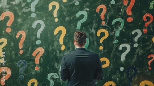 Businessman Contemplating Choices in Front of Colorful Question Marks: A Symbol of Decision-Making and Uncertainty