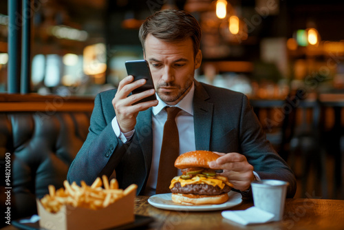 Businessman enjoying a gourmet burger with fries while checking his smartphone in a modern restaurant