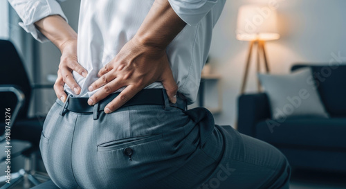 Businessman experiencing lower back pain holding his back with hands in office; lumbar discomfort ache concept
