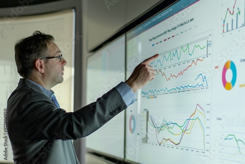Businessman giving a presentation using an interactive screen displaying various graphs and charts related to data analytics.