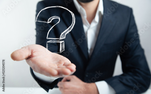 Businessman hand hold interface question marks sign web,
