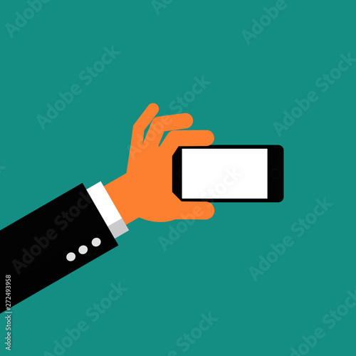businessman hand holding smartphone isolated on blue background. vector illustration.