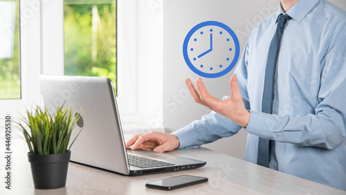 Businessman hand holds the icon of hours clock with arrow. Rapid execution of the work.Business time management and business time is money concepts
