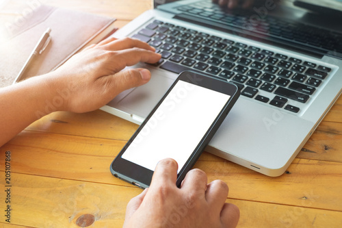 Businessman hands holding and using mobile smartphone in office. and computer screen.Close up