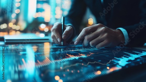 Businessman hand-writing and reading financial data on a digital screen with a chart, graph