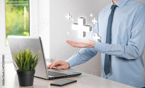 Businessman hold 3D plus icon, man hold in hand offer positive thing such as profit, benefits, development, CSR represented by plus sign.The hand shows the plus sign
