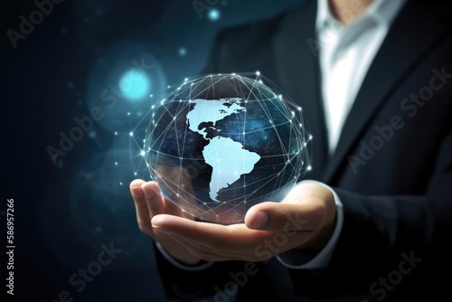 Businessman hold global business globe with network connected to digital marketing strategy and creative solution. Business development technology to support creativity idea - Generative AI