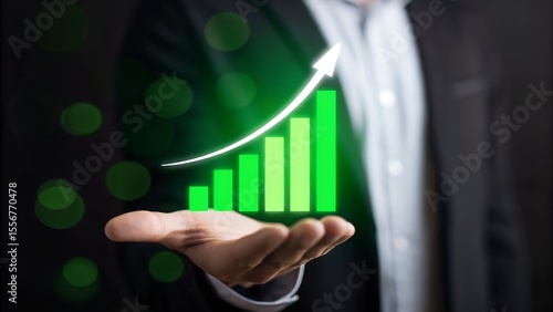 Businessman holding a glowing green bar graph with an upward trending arrow