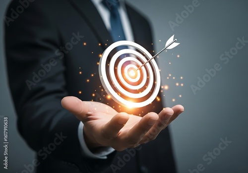 business, target, success, goal, achievement, strategy, aim, bullseye, arrow, dart, precision, sharpened, vision, objective, marketing, sale, performance, growth, planning, execution, direction, purpose, ambition, determination, commitment, leadership, management, corporate, finance, investment, profit, revenue, businessperson, entrepreneur, hand, holding, glowing, light, digital, futuristic, concept, idea, innovation, technology, datum, insight, visionary